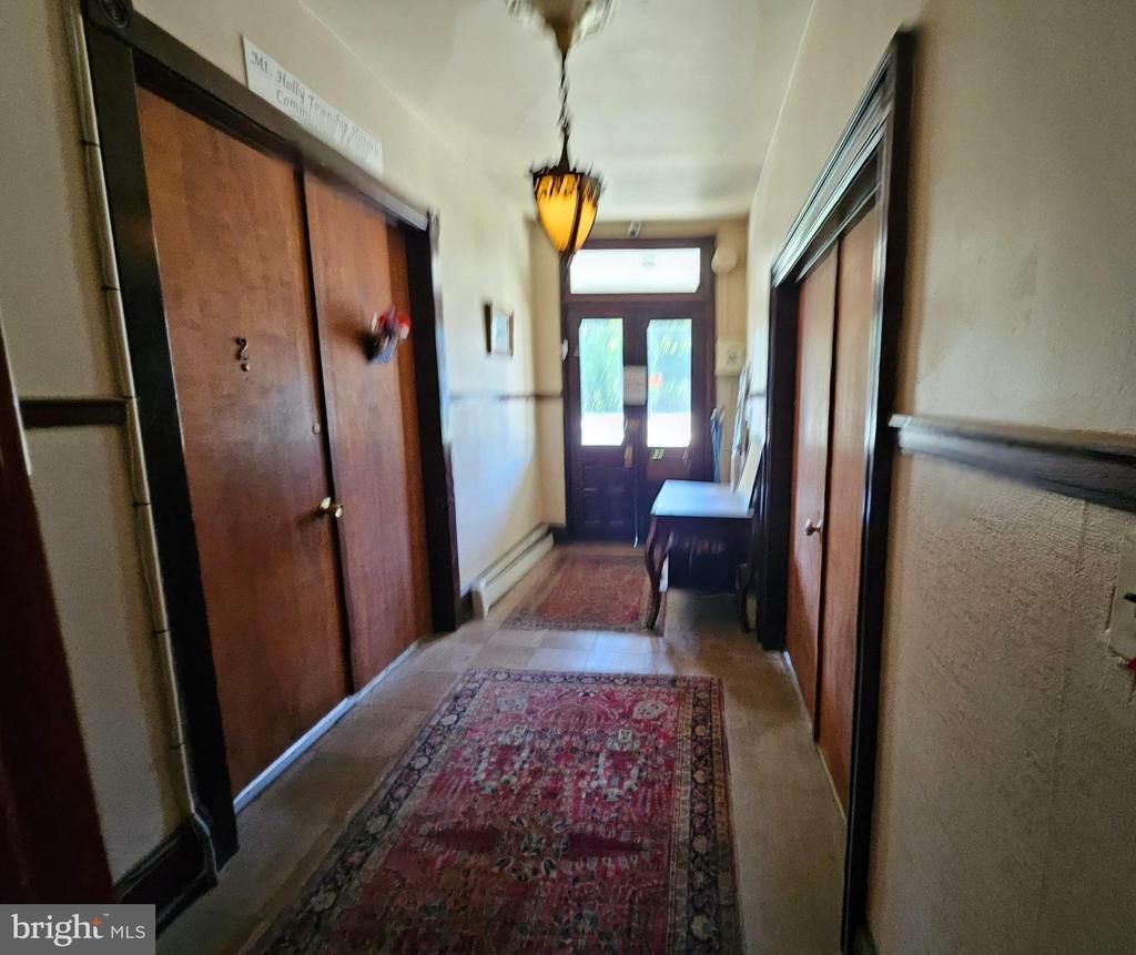 Spacious 1st floor 2 bedroom apartment with large office (or possible 3rd bedroom) in a well maintained historical building in the town of Mount Holly. Convenient location, close proximity to shops and major roadways. Shared laundry room for building tenants located on 1st floor. A/C window units to be provided by tenant.