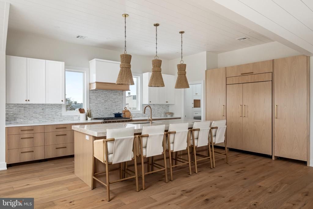 Welcome to DRIFTMARK, a stunning new construction home in Loveladies. Architectural plans by CWB Architecture, construction by the Ted Fluehr Jr Custom Homes, and the full exterior and interior design direction by Cass Thurston Interiors. This reverse living coastal residence blends architectural clarity with warm, layered interiors and custom millwork throughout. The private backyard is built for Summer with a 12x31 heated saltwater pool, gas fire pit, covered patio, and outdoor kitchen featuring a Weber grill and Summit refrigerator. The three car garage and additional storage area wired and plumbed for a future refrigerator and half bath add convenience. Accessible by stairs or elevator, the middle level offers three ensuite bedrooms, two additional bedrooms , full hall bath, family room with a custom large built-in media center, and laundry room with sink and cabinetry. The top floor showcases a chef's kitchen with six burner Wolfe range, 48" SubZero refrigerator, Bosch dishwasher, custom cabinetry, quartz counter tops and a feature Taj Mahal island. A walk-in pantry is equipped with sink, microwave, Zephyr beverage cooler and additional dishwasher. The light filled great room features wide plank flooring and a gas fireplace with stone surround. Dining opens to a wraparound deck with expansive bay views. The primary suite includes dual closets, private balcony, and a spa style bath with freestanding tub, custom shower, double vanity and make-up vanity. The rooftop deck captures panoramic bay and ocean views. Turnkey and ready well ahead of Summer 2026, with a partially furnished option available for an even more seamless move-in experience.