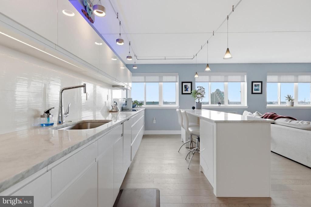 Stunning, fully remodeled bi-level condo featuring magnificent views of the Delaware River and the iconic Benjamin Franklin and Walt Whitman Bridges. Upon entry, you’ll immediately appreciate the modern, minimalist design and open floor plan. The kitchen showcases a polished, contemporary aesthetic with a strong emphasis on clean lines, natural light, and functionality. Completed in 2019, it features high-gloss white flat-panel cabinetry with a sleek, handleless design, complemented by quartz countertops for both style and durability. Premium Bosch stainless steel appliances include an induction cooktop, stacked built in oven and microwave, while the integrated dishwasher blends seamlessly into the cabinetry. Additional storage in the built in pantry. The central island offers ample prep space along with seating for four. A wood accent panel adds warmth and visual contrast, while white oak engineered flooring flows throughout the home, creating a balanced and inviting tone that complements the crisp white finishes. Just off the kitchen, the open living and dining area is drenched in natural light, highlighted by a dramatic wall of windows that enhances the space and makes it ideal for both relaxing and entertaining. This inviting space is anchored by a wood-burning fireplace with a stacked stone accent and mantle, creating a warm and sophisticated focal point. The powder room, remodeled in 2022, features a sleek floating vanity with custom cabinetry, a Toto toilet, and ceramic tile flooring. For added convenience, the main level also includes a washer and dryer. New carpeting leads to the second level and your private primary suite sanctuary. Filled with natural light from oversized slider, the suite offers breathtaking views of the Delaware River and the Benjamin Franklin Bridge. Thoughtfully designed, it includes built-in storage, a dedicated makeup vanity, and three spacious closets. Step outside to your private balcony—perfectly sized for outdoor furniture and relaxing while taking in the view. Mornings are effortless with programmable Hunter Douglas blinds that open automatically, allowing you to start your day with stunning riverfront scenery. The primary bathroom, renovated in 2019, is designed for both comfort and luxury. It features a floating vanity and a spacious walk-in shower, 80 x 53, equipped with body jets, a handheld sprayer, and a rain shower head for a spa-like experience. Two built-in niches provide convenient storage, while the Toto toilet is tucked away in a private water closet, separated by a stylish barn door. A linen closet adds additional storage. Further upgrades include Pella windows, Mitsubishi mini-split systems for efficient heating and cooling, engineered flooring, along with Hunter Douglas blinds installed throughout the home. Ideally located in the heart of Society Hill and Queen Village, this home offers the perfect blend of historic charm and vibrant city living. Enjoy walkability to Headhouse Square Farmers Market, top-rated restaurants, Penn’s Landing, and South Street—placing dining, shopping, and waterfront attractions just steps away. The building offers 24/7 doorman service with on-site maintenance for added convenience and peace of mind. Residents also enjoy access to a fitness center, community/party room, and a beautifully maintained garden area. Parking is available for an additional fee in the on-site garage located beneath the building.