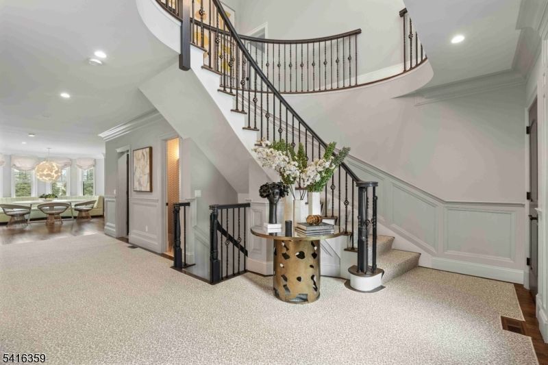 Step into a world of refined living where stunning architectural detail meets iconic style. Upon entering, a dramatic sweeping staircase and striking chandelier set the tone for the home's distinctive design. The main level offers spacious living and entertaining areas, including a family room with a fireplace, coffered ceilings, and a custom built-in wet bar with wine fridge. Extensive custom millwork further enhances the sophisticated character throughout. The chef's kitchen features custom cabinetry, quartz countertops, marble backsplash, high-end appliances, and a large center island. Enjoy meals in the sunlit breakfast area framed by windows overlooking the backyard. Upstairs, the primary suite offers a private retreat with tray ceiling, cove lighting, fireplace, spa-like bath with freestanding soaking tub, and an expansive custom walk-in closet. Additional highlights include four generously sized bedrooms with well-appointed bathrooms and a conveniently located second-floor laundry. The finished walk-out lower level expands the living space with a dedicated movie theater complete with surround sound, along with a recreation area ideal for a gym, billiards room, or play space with walk-out access to the backyard. Additional features include a convenient mudroom off the three-car garage, multi-zone heating and cooling, and a spacious backyard offering endless potential for outdoor living and entertaining.