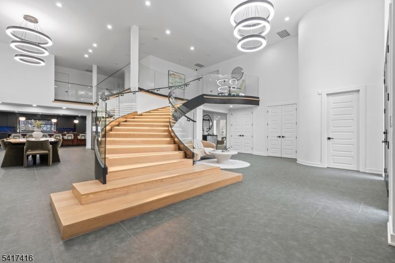 Elegantly designed Contemporary masterpiece showcasing exceptional craftsmanship and impressive scale throughout. A dramatic two-story entry foyer opens to a professionally designed curved glass staircase. Continue onto a soaring two-story living room with cathedral ceilings and an elevator that leads directly up into your 1400 sqft resort style primary suite. Custom moldings and quality hardwood floors enhance the home's refined character. The oversized, state-of-the-art eat-in kitchen is equipped with custom cabinetry, granite countertops, a 20ft. center island with sink, top-of-the-line appliances, a spacious breakfast area, butler's pantry, and built-in glass wine rack. Sliding glass doors lead to a private backyard with deck, ideal for indoor-outdoor entertaining. The expansive finished basement offers a second living space, bedroom suite, laundry room, and walk-out directly to backyard. Meticulous attention to detail throughout. Offering roughly 10,000 square feet of gracious living space, this exceptional residence is ideally located in the highly desirable neighborhood of Livingston, NJ.